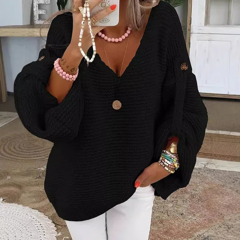Lady Casual Knitted V Neck Sweater Fall Winter Fashion Button Warm Commuter Jumper Elegant Solid Adjustable Long Sleeve Pullover