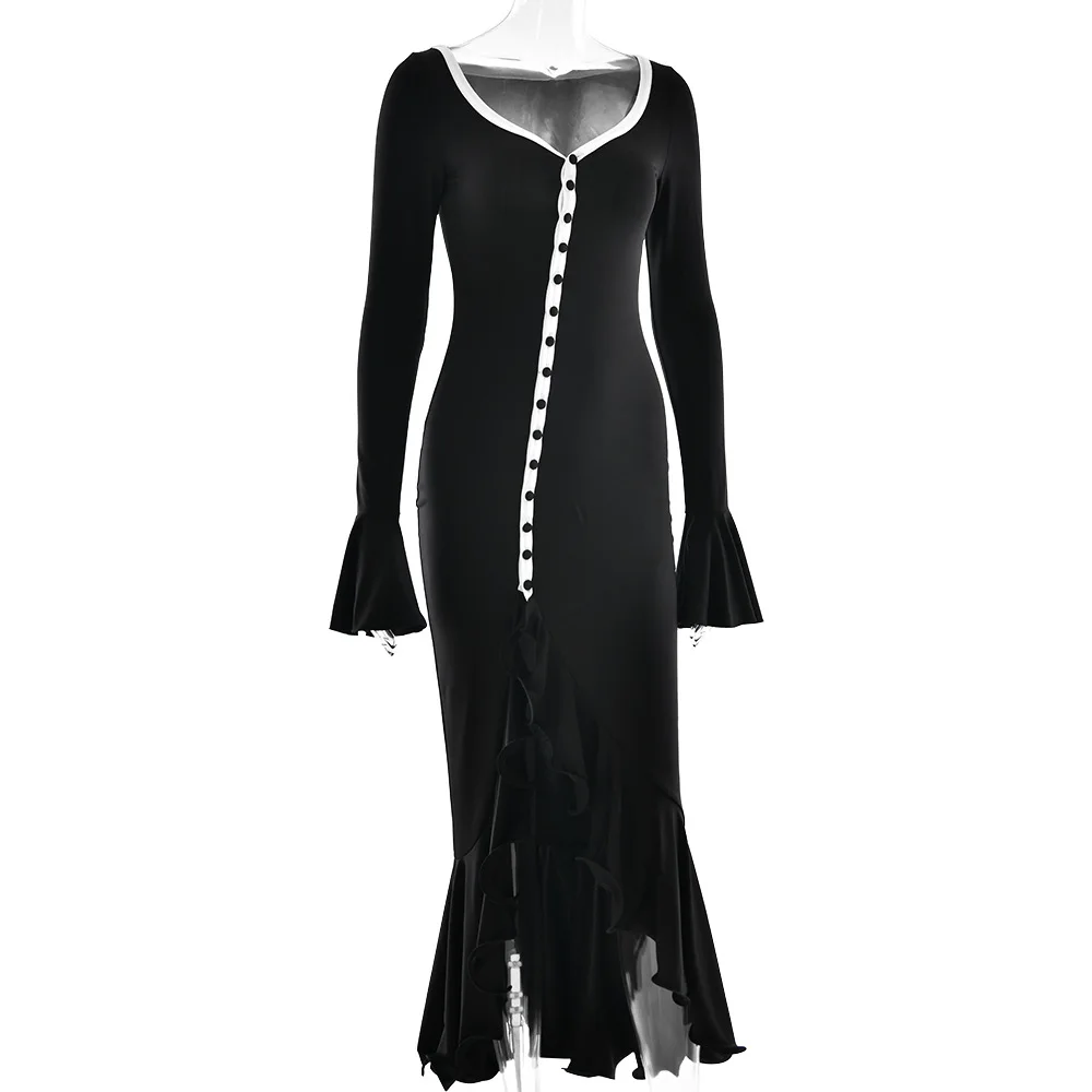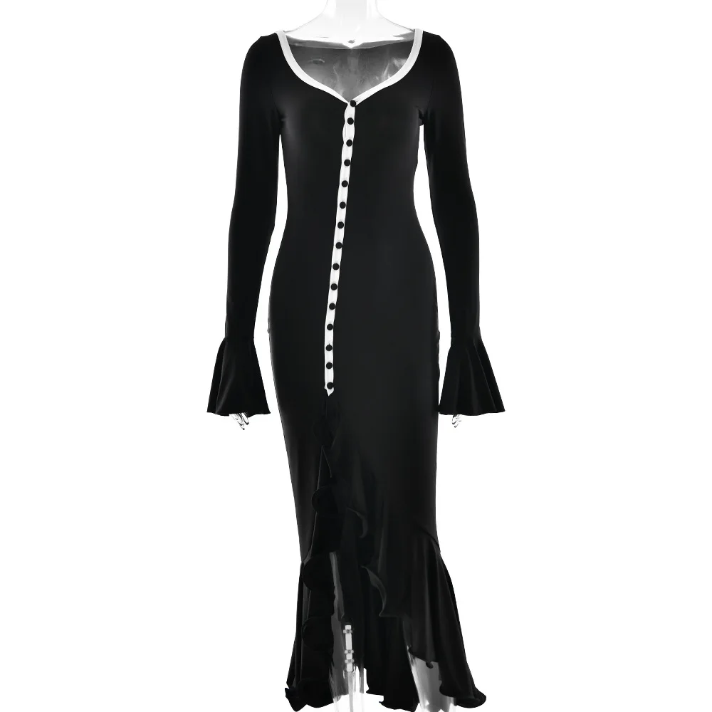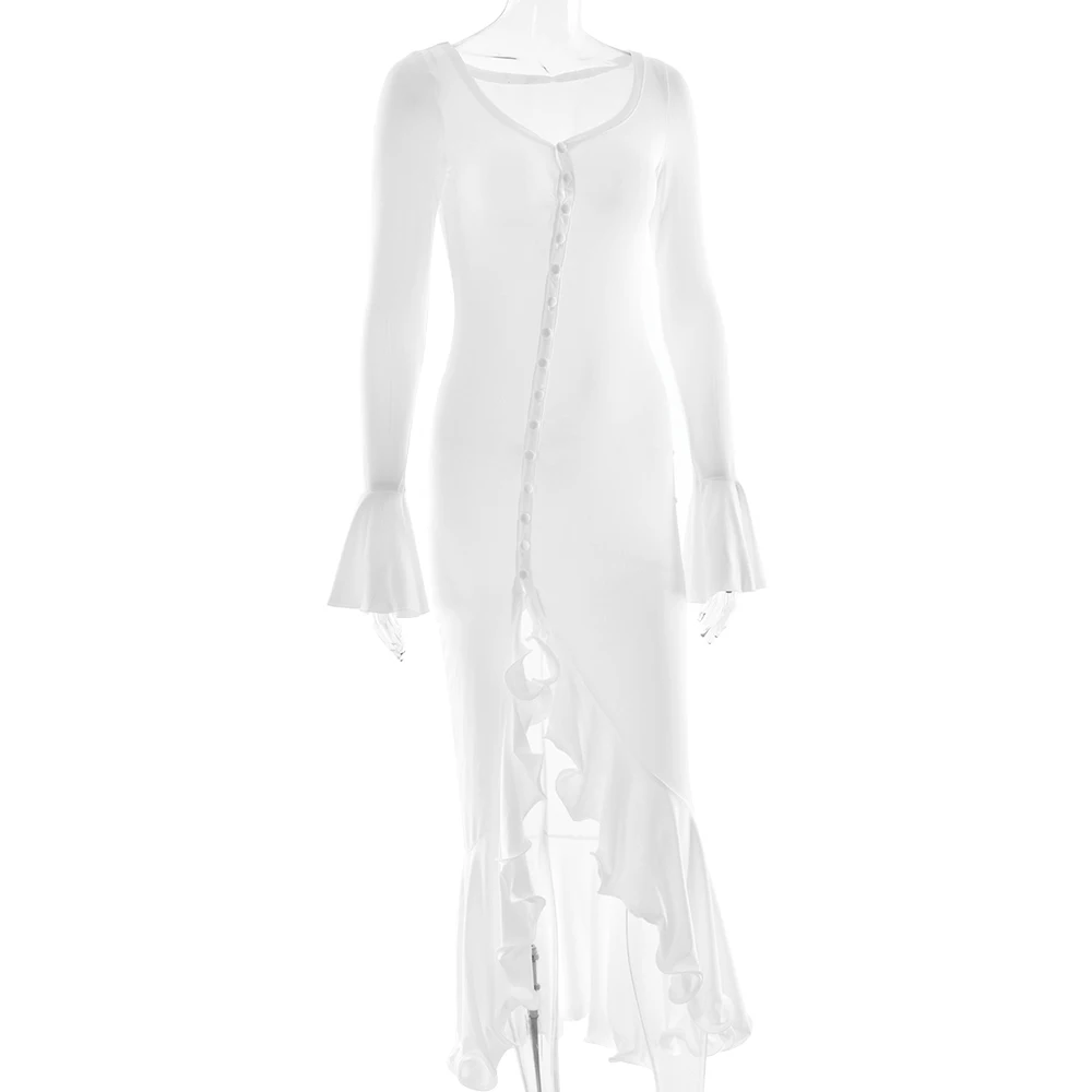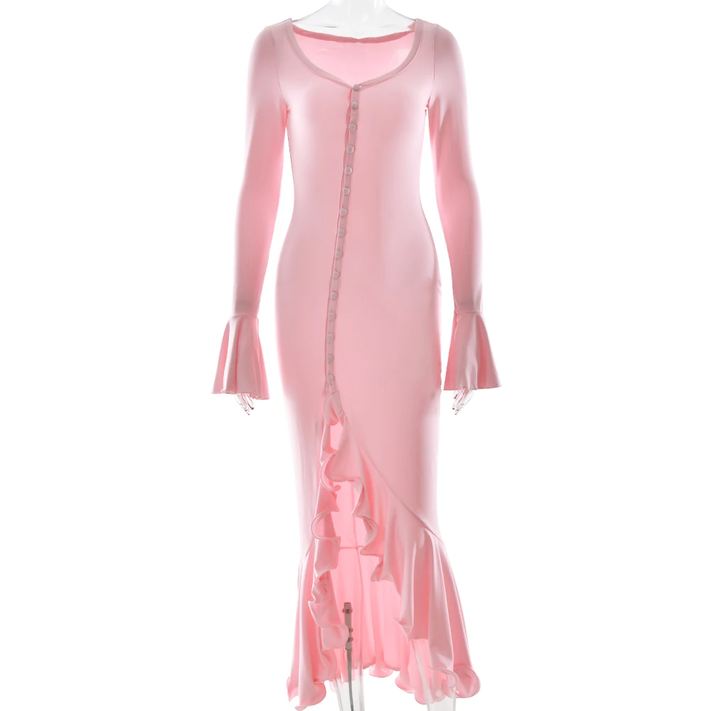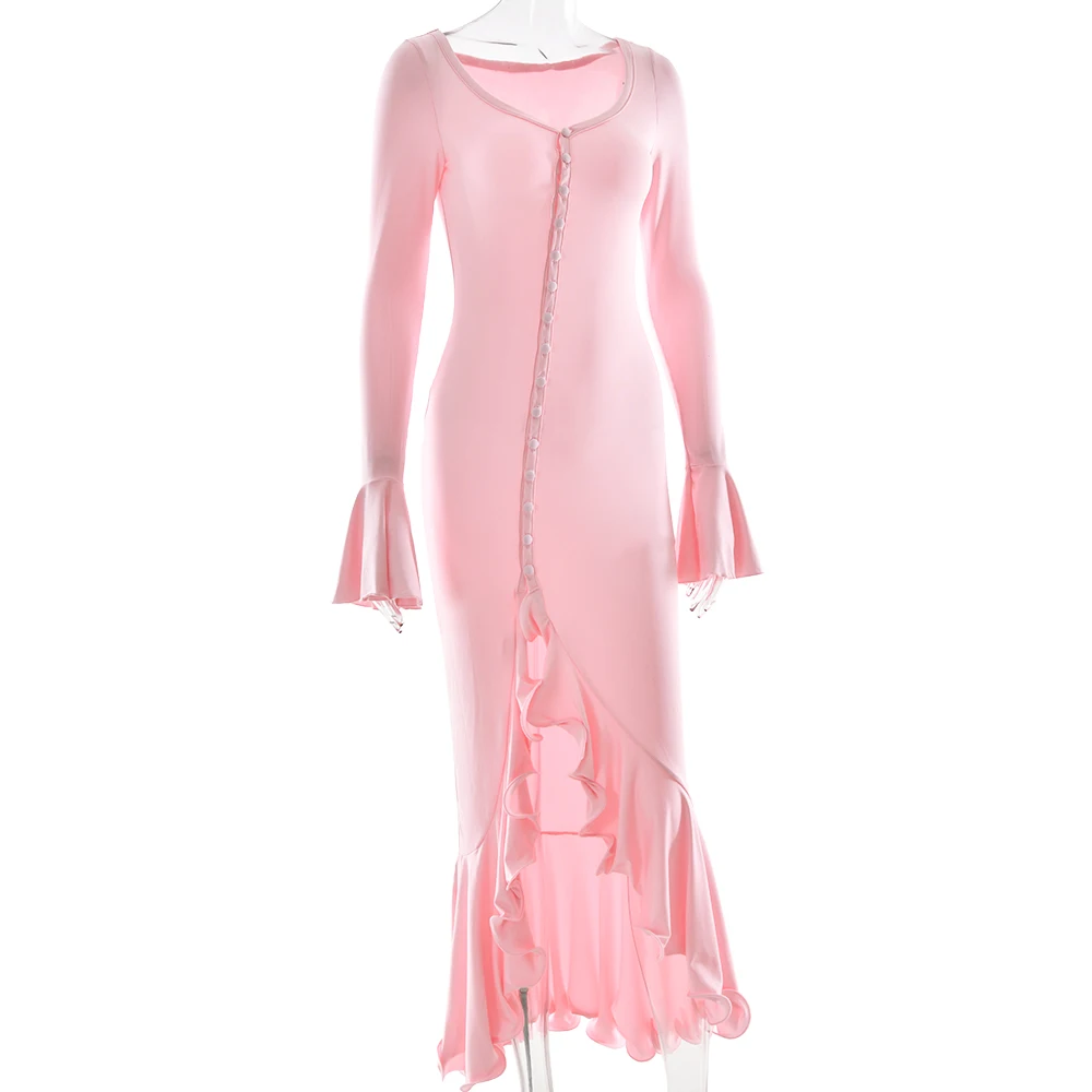 Sexy Deep V-Neck High Slit Ruffle Women Dress Pink Flare Sleeve Single Breasted Dress Autumn Slim Party Evening Dress