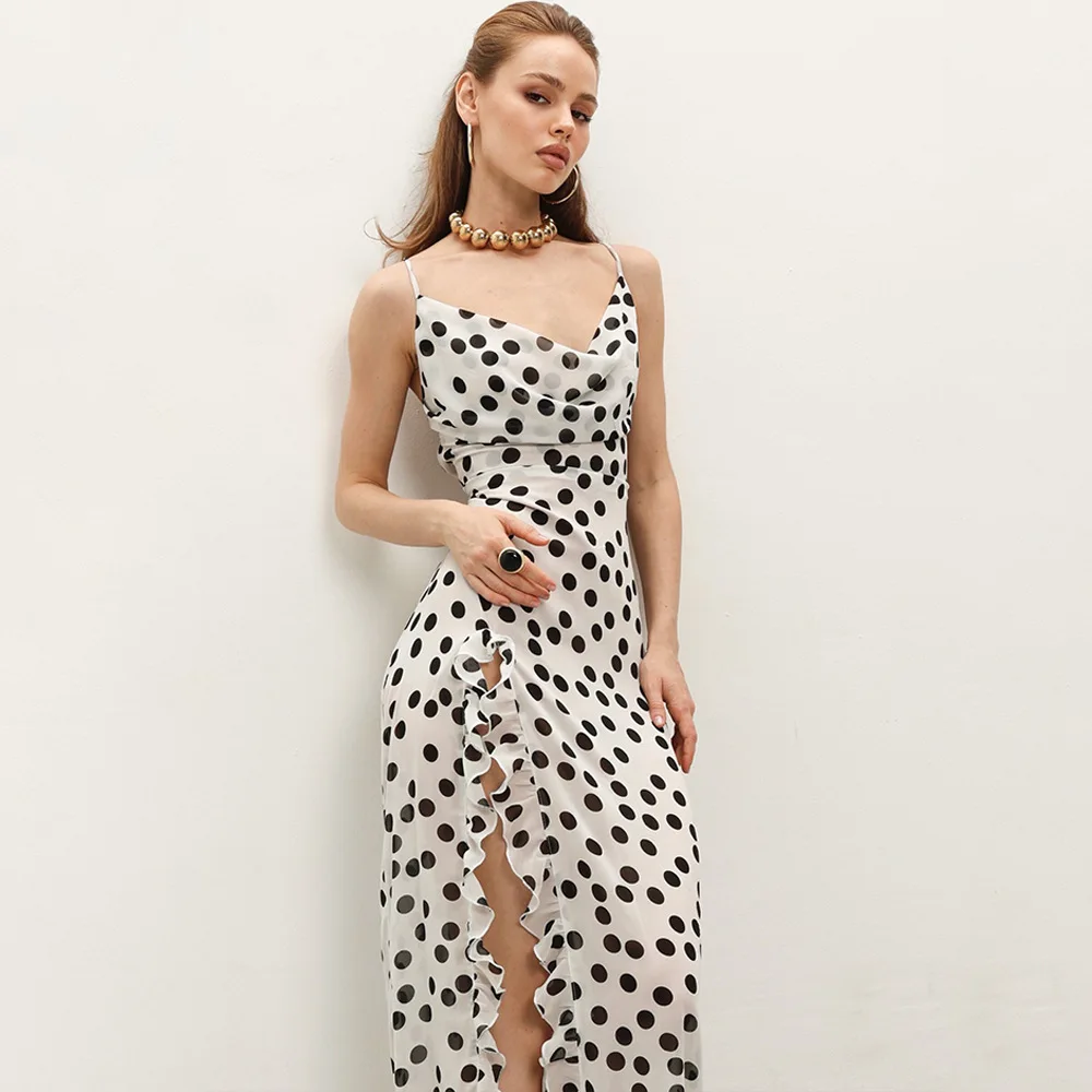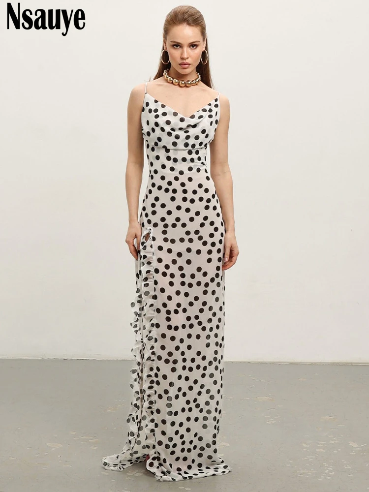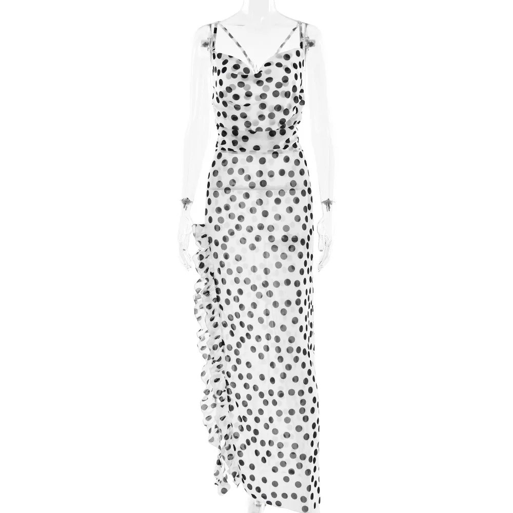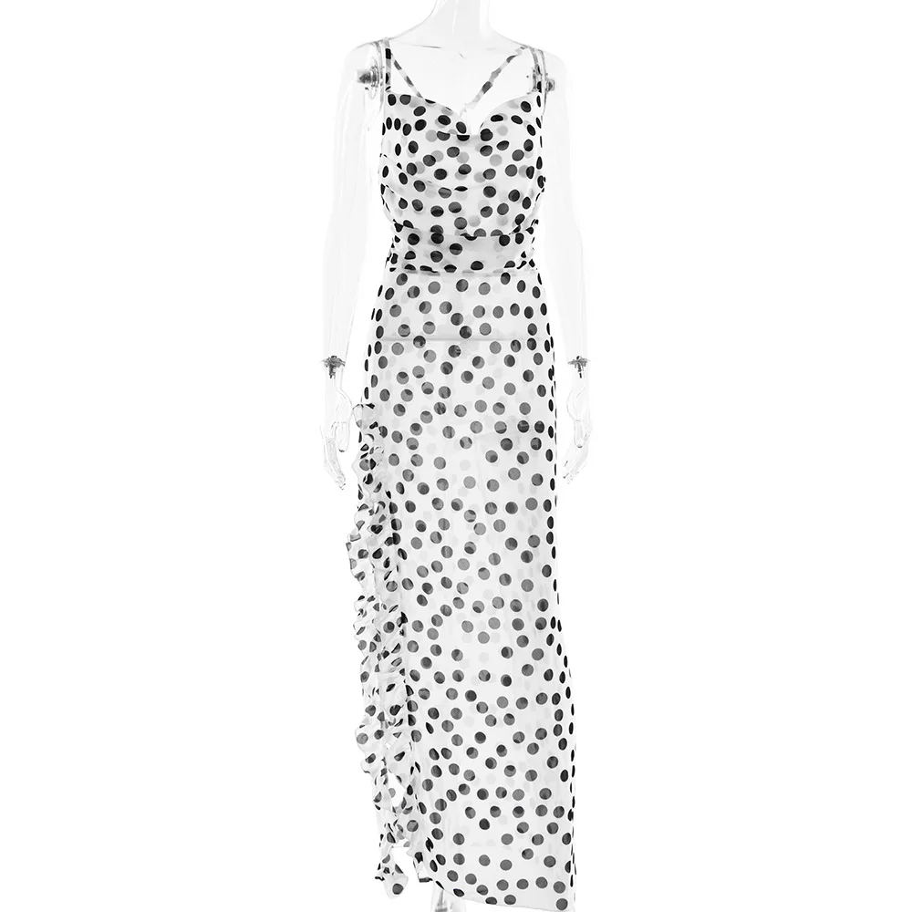 Sophisticated Women's Evening Dress with Ruffles and Polka Dot Floral Print for Summer 2025 Party and Beach Events